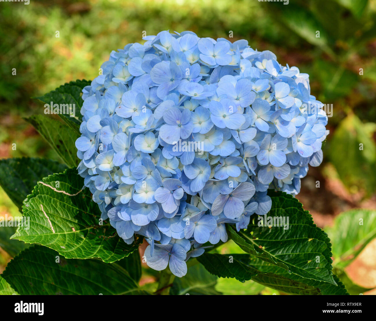 Purple Blue Flower Of Bigleaf Hydrangea With Yellow Shade Stock