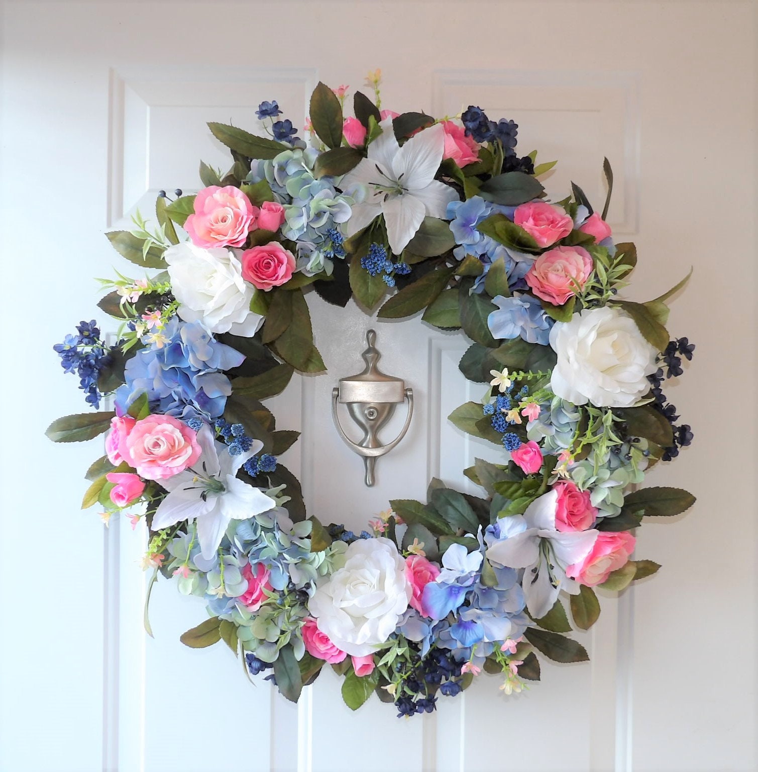 Pink Roses Blue Hydrangea White Roses And White Lily Etsy