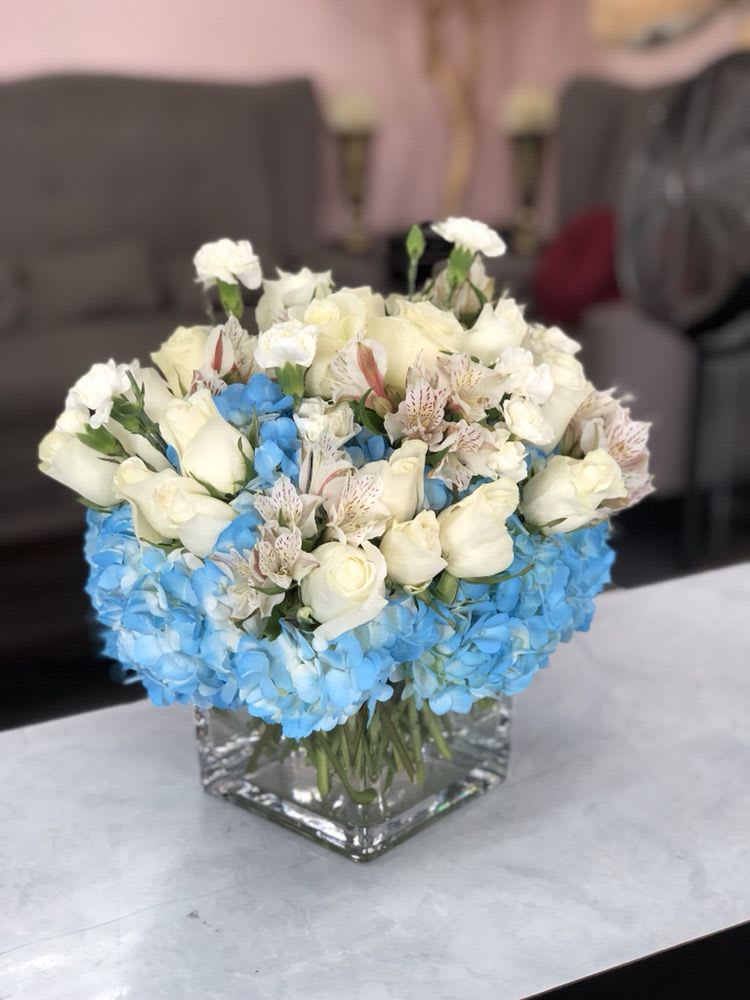 White Roses Blue Hydrangeas Cube In Warwick Ri Petals Florist