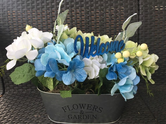 Blue Hydrangea Floral Arrangement With Welcome Sign Etsy