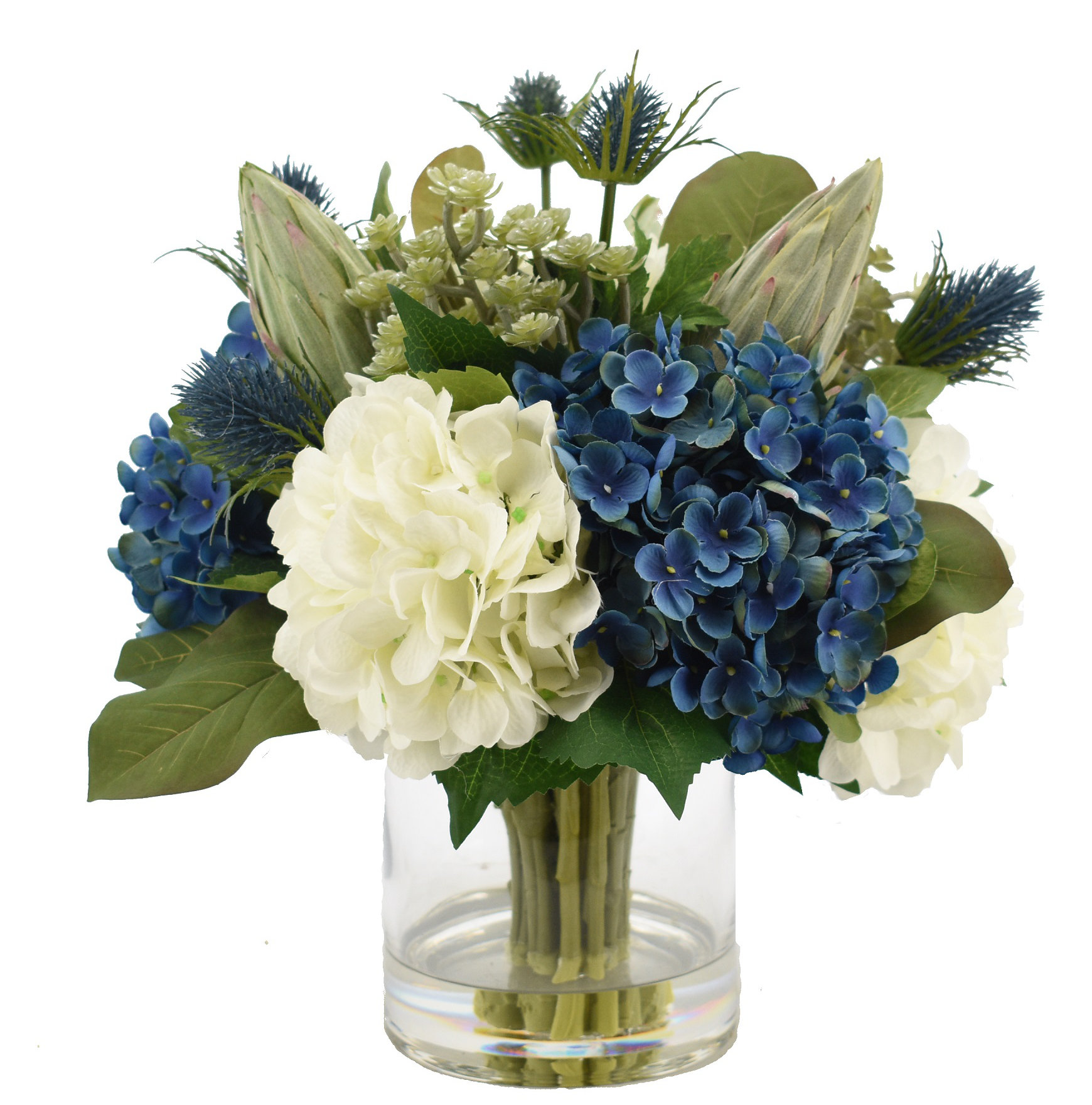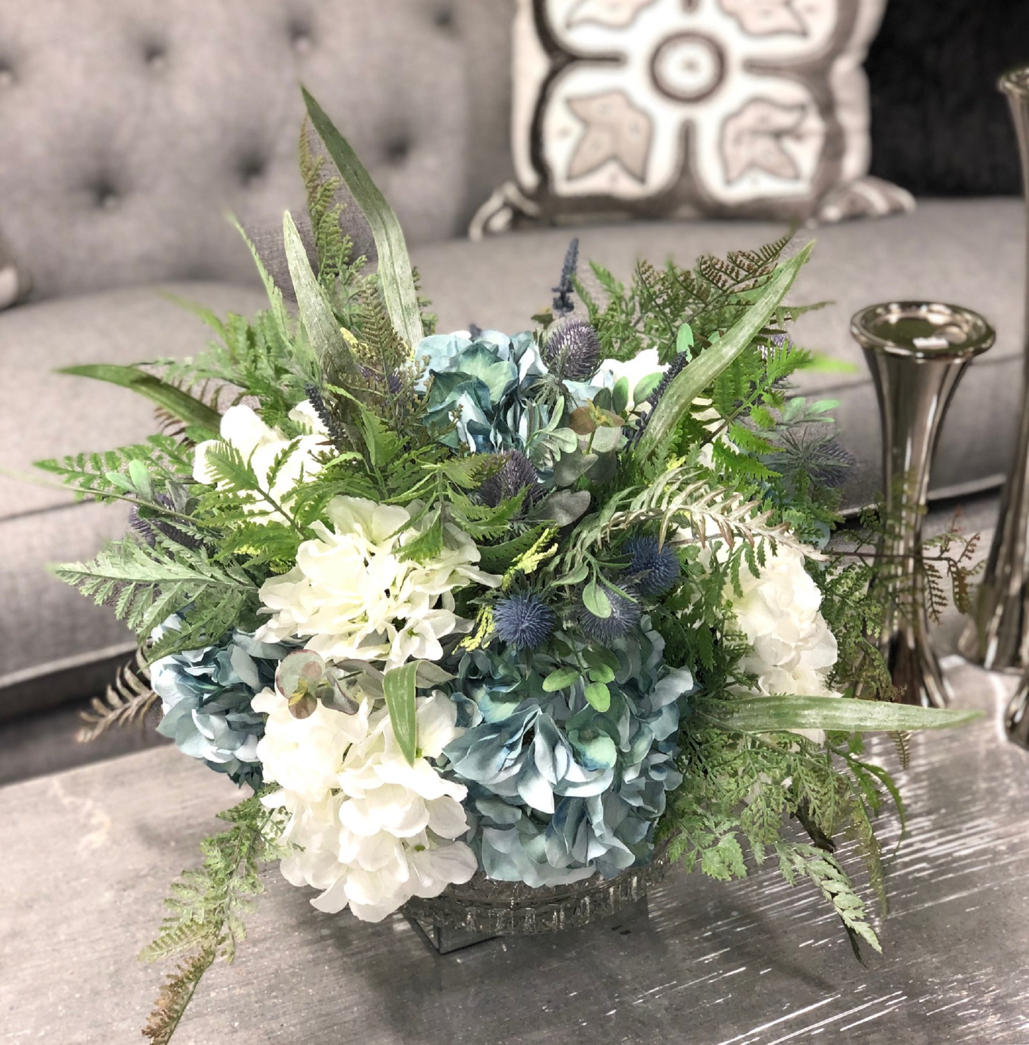 Nantucket Blues Hydrangea Succulent And Thistle Arrangement In