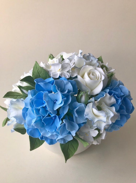 Table Centerpiece With Blue Hydrangea White Peony And Roses Etsy