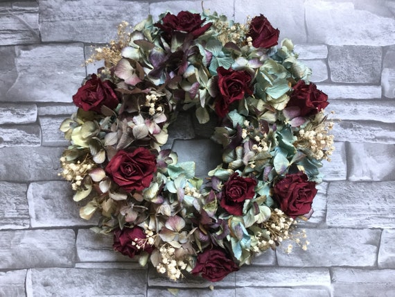 Dream Beautiful Real Hydrangea Wreath In Blue With Dark Red Etsy