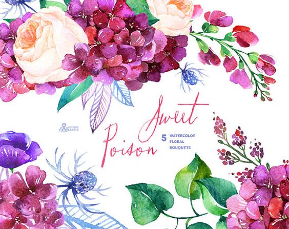 Sweet Poison 5 Watercolor Bouquets Hydrangea Roses Poppy