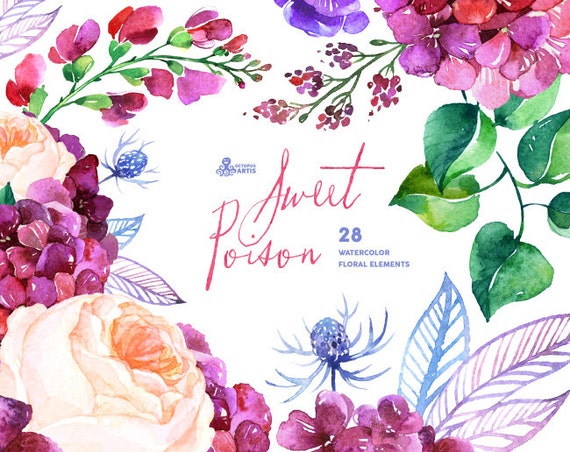 Sweet Poison 28 Watercolor Elements Hydrangea Roses Poppy Etsy