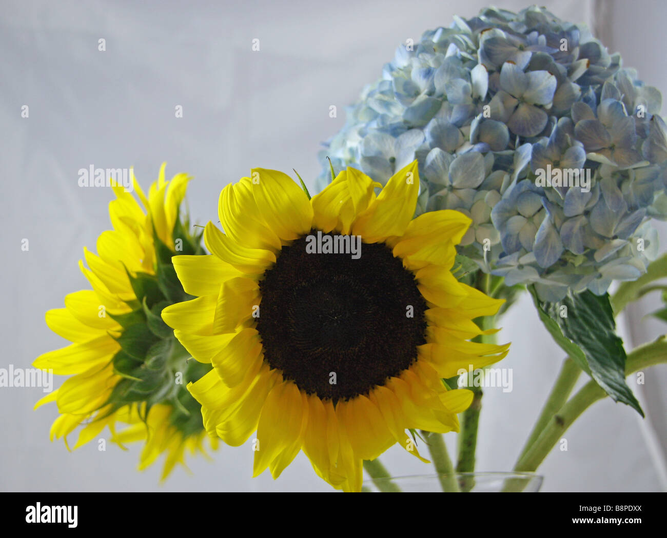 Beautiful Blue White Hydrangea And Bright Yellow Sunflowers Stock