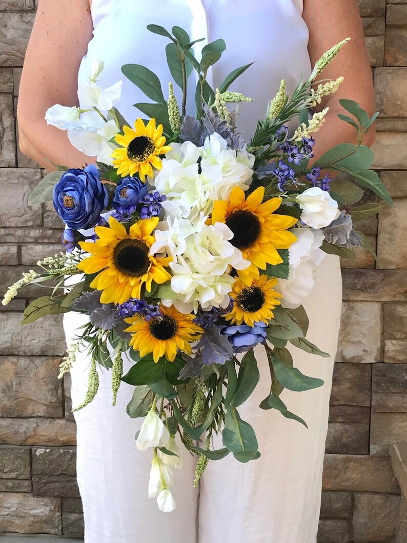 Blue And Yellow Bridal Bouquet With Sunflowers Hydrangea