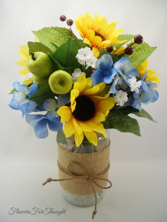 Sunflower Centerpiece With Hydrangea And Burlap Blue And Etsy