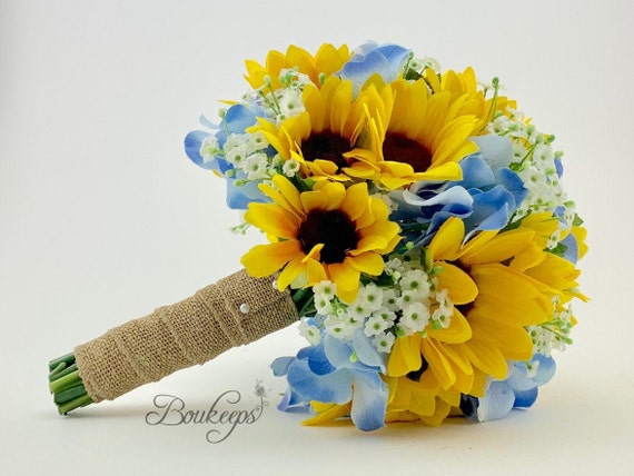 Golden Yellow Sunflower And Blue Hydrangea Silk Flower Wedding Etsy