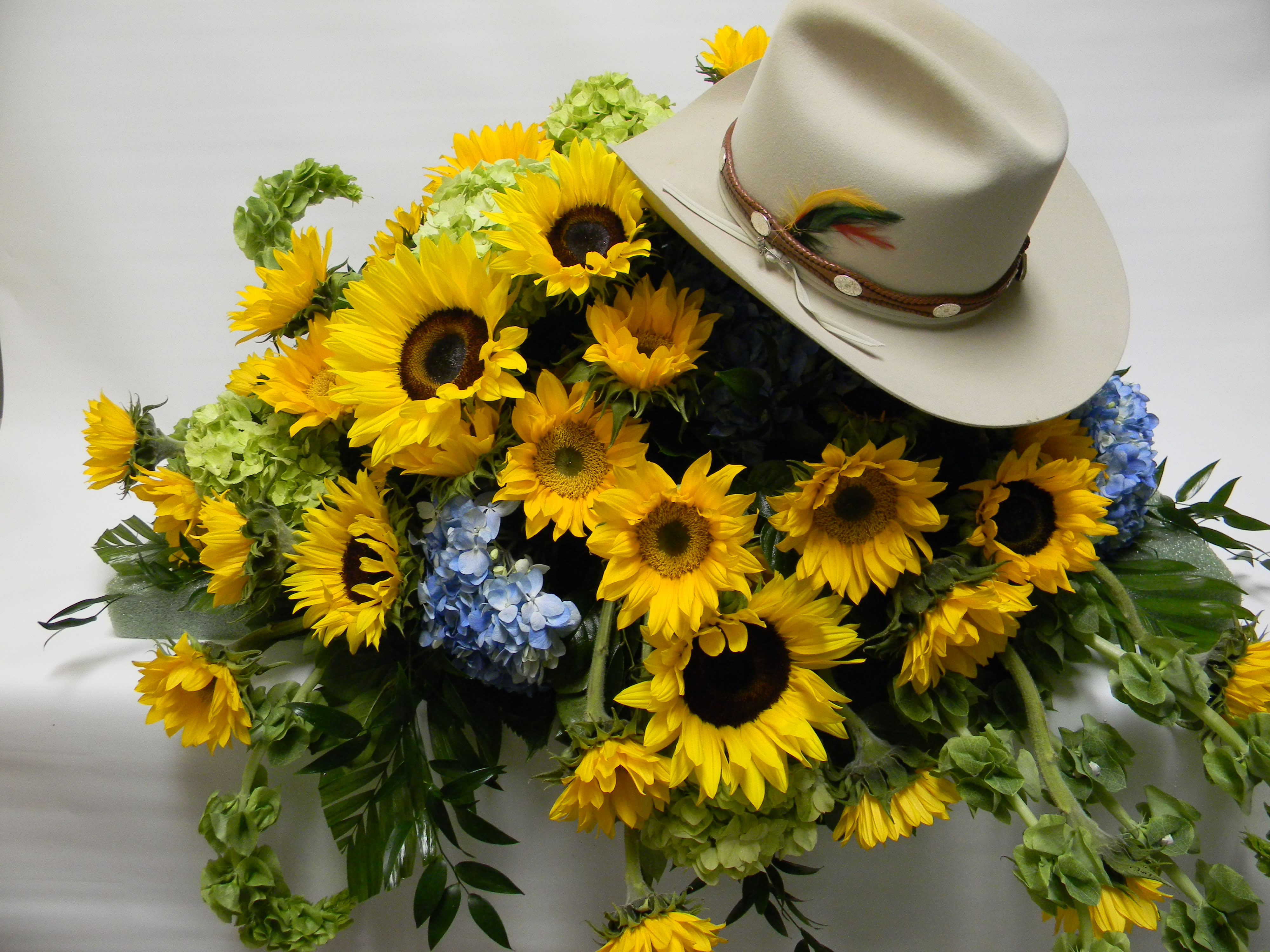 Standing Spray With Sunflowers And Blue Hydrangea By Flowers At