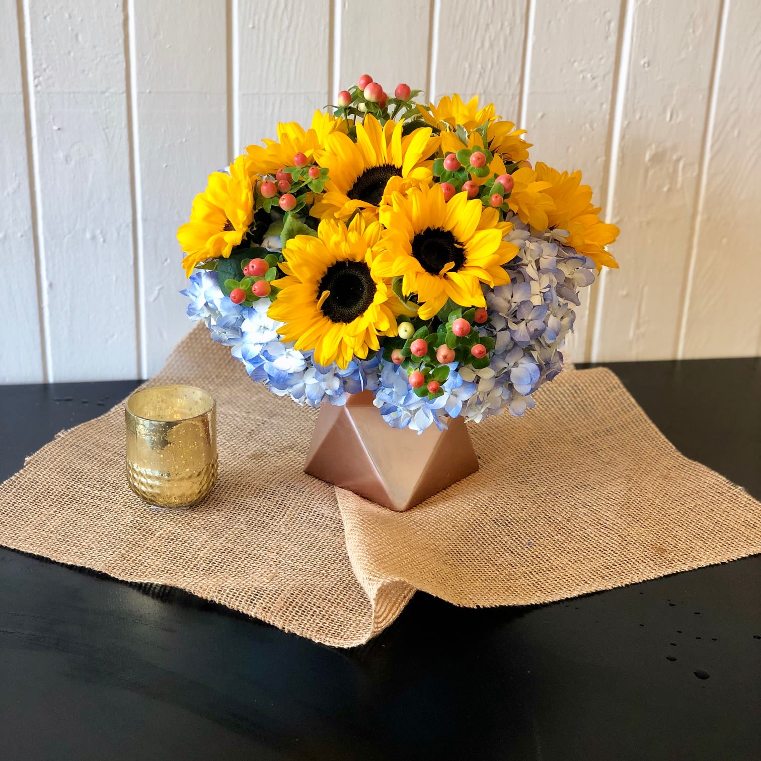 True Blue Hydrangeas And Sunflowers By Floral Artist Nancy Medina