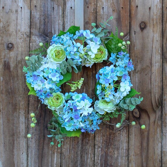 Blue Hydrangea Green Ranunculus Spring Summer Floral Wreath Etsy