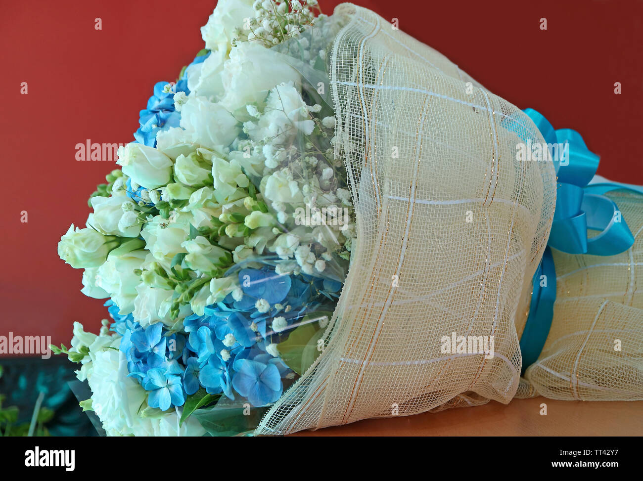 White Rose And Blue Hydrangea Bouquet On The Table Stock Photo