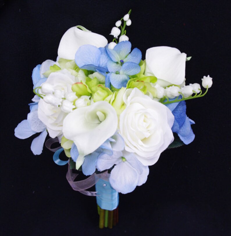 Blue Hydrangea White Mini Calla Lilies White Roses Blue Wedding