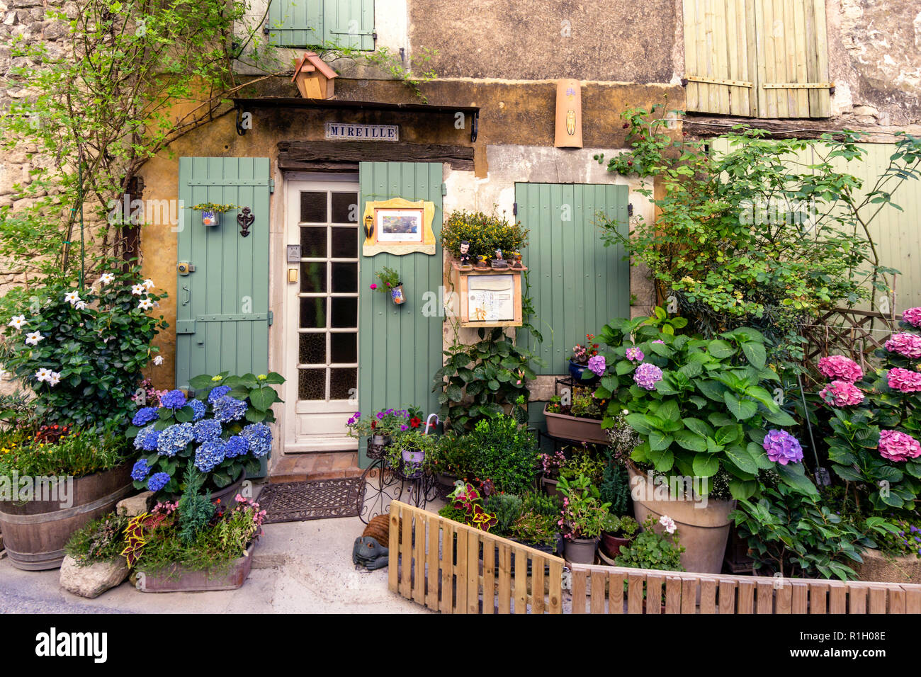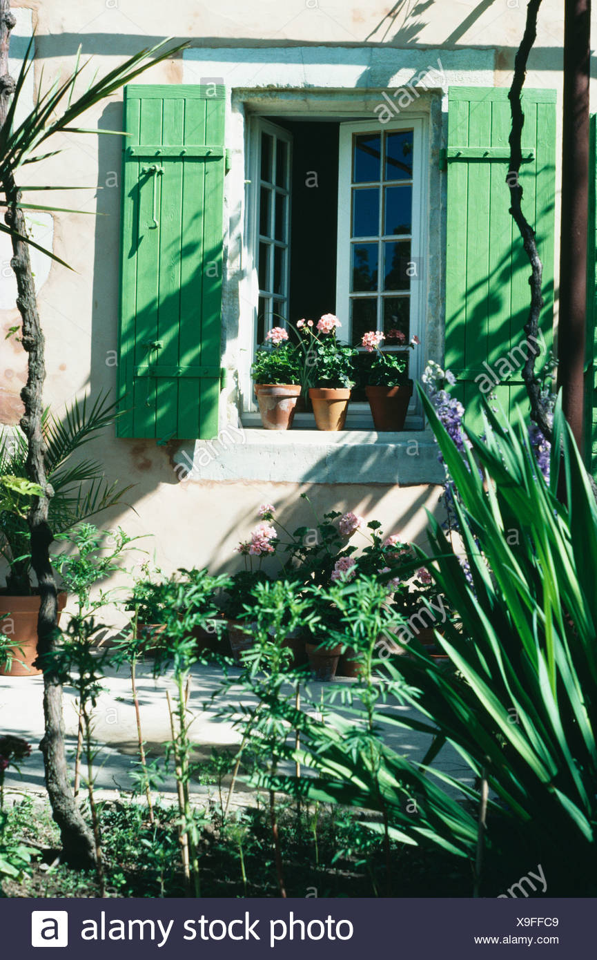 Piccolo Giardino Davanti Casa Provenzale Con Persiane Verdi Sulla