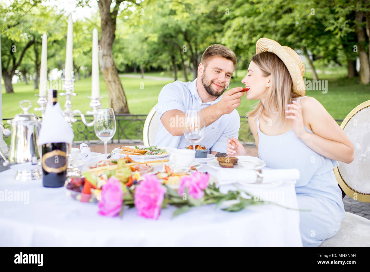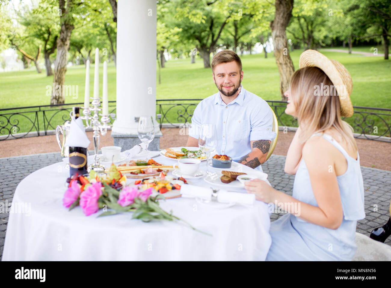 Immagini Stock Prima Colazione Romantica Su Una Terrazza Estiva