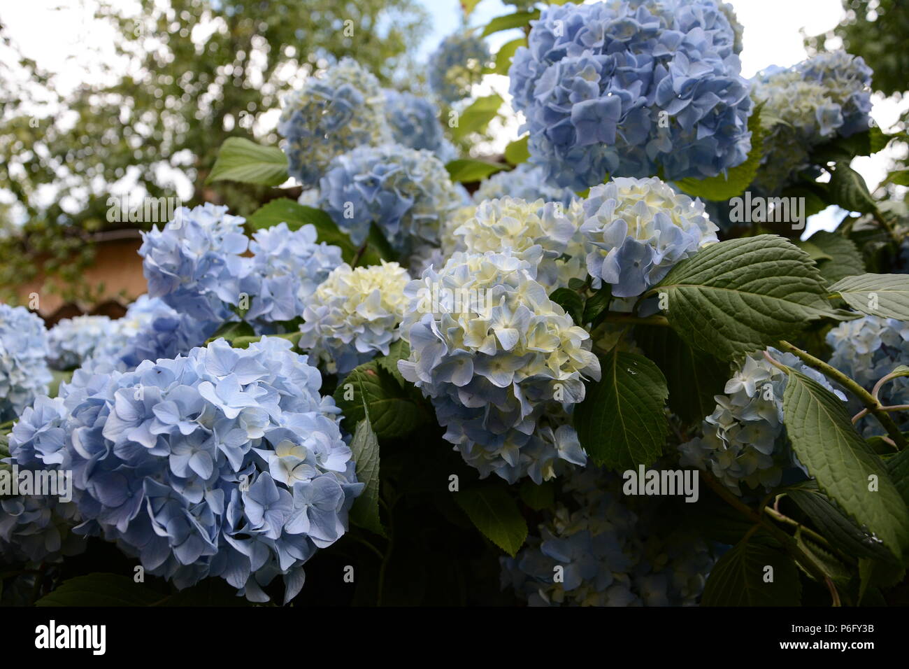 Blue Hydrangea Garden With Green Leaves In The Garden Stock Photo