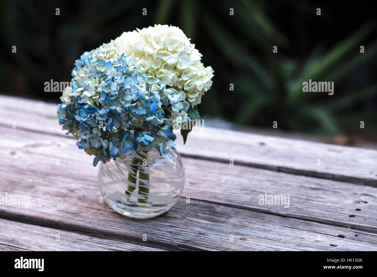 White And Blue Hydrangea Flowers In A Glass Vase On A Rustic Wood