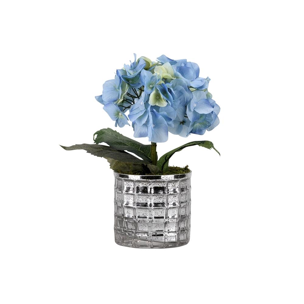 D W Silks Indoor Blue Hydrangea In Round Mirrored Glass Vase