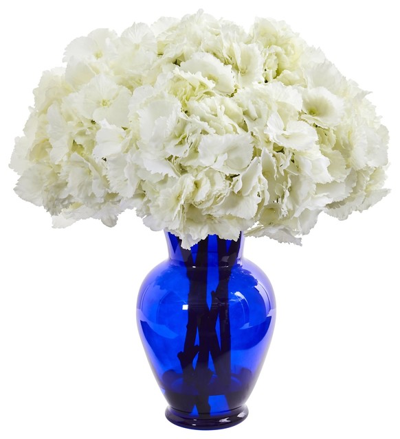 Artificial Flowers Hydrangea White Arrangement In Blue Vase