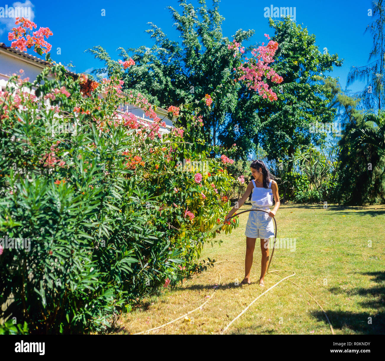 Giovane Donna Innaffiamento Di Fiori E Piante Giardino Tropicale